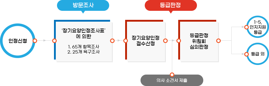 | 인정조사결과 의사소견서 특기사항 | 일상생활자립도 등급별상태상 등 | 1등급 : 95점이상 2등급 : 75점이상 95점미만 3등급 : 60점이상 75점미만 4등급 : 51점이상 60점미만 5등급 : 45점이상 51점미만&치매 인지지원등급 : 45점미만&치매 |